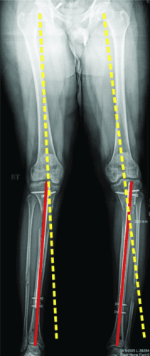 在外部机构胫骨身材延长并出现双侧并发症的患者。他发展了胫骨和 Abu/a 延迟结合,右侧是敲击 {外翻),左侧是弓形 {内翻),两侧是 f1exion {procurvatum}。我们在手术室使用临时外部斧头机对两侧进行了急性矫正,并放置了新的胫骨杆。我们在 Abu/a 延迟结合上放置了逆行杆。